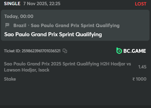 Hi guys, I have placed the bet on Hadjar to win F1 sprint Qualifying H2H Hadjar vs lawson. Hadjar finished 9th and lawson on 17th but my bet has lost. what should I do I cannot connect the customer support also.