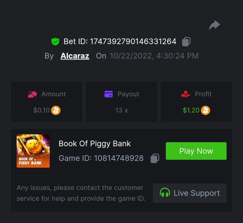 Event Team Niobium Posted October 21, 2022 Event Team Share Posted October 21, 2022 (edited) $1,500 Weekend Multiplier Battle Greetings players! We're pleased to announce a new weekend-long tournament with the Spinomenal provider. The tournament will take place from October 21 at 1:30 pm GMT until October 24, at 1:30 pm GMT. There are a total of 2 slots, in which the ranking is built based on the highest possible multipliers. The fun doesn't stop there, all eligible participants will be awarded and will enjoy their prizes shortly. Don't miss out on this thrilling battle! (More details below). Duration: 21/10/2022 1:30pm – 24/10/2022 1:30pm UTC Prize Pool: $1,500 Eligible Games: Play below games to participate in this event: Book of Piggy Bank Story of The Samurai - The Last Ronin The highest multiplier reached in each game will be added together and counted as total points. Bonus buys are allowed. If the player submits multiple winning entries for the same game, the entry with the highest multiplier will be valid. Minimum VIP Tier Must be VIP04 or higher in order to enter this event. Minimum Payout Minimum payout to qualify is 10x (in any game) for a valid entry. Minimum Bet Size Book of Piggy Bank - $0.10 Story of The Samurai - The Last Ronin - $0.25 Eligible Coins All cryptocurrencies are eligible (excepting JB, and BCL). Free Play Mode is not valid for this event. Prize Pool & Reward Breakdown The winners will win a share of the prize pool based on the detailed ranking below. All other participants who complete all minimum requirements will receive a 35% share of the prize pool. How to Enter Access the game to select your Bet ID, click on the Share icon (↷) and then Copy link. Return to the topic, paste the link in the field "Reply to this topic..." E.g.: https://bc.game/#/sd/10VI4C5YU35NV7 In the same post, upload a screenshot of your win by clicking the game ID WITH VIEW IN USD mode ENABLED (accessible at the bottom of dropdown menu for your wallet up top, and Submit Reply. Done! This way, we can ensure that your bet indeed met the minimum requirement at the time of placing it: https://bc.game/#/sd/10VI4C5YU35NV7 Additional Rules: Please combine all of your hits together in a SINGLE post. Edit your existing post for additional hits, don't create a new post. Each eligible entry must have the Bet Slip URL, failure to include it will disqualify participation in the event. Bet Slip image is not mandatory. Bets must be posted within 24 hours of placing bet in order to keep things fair for everyone. Bets must be made during the specified time window stated above. This thread will lock automatically when the time period is over. One (1) entry per household. Anyone found attempting to win multiple prizes will be disqualified from this challenge as well as all future challenges. Failure to follow instructions will result in your submission being null and void. By entering this challenge, you acknowledge that BC.Game has the final decision on results and placement. Payouts will be distributed after the event is finished. Please note that it could take anywhere between 24 hours to 7 days after the completion of the event. Edited October 21, 2022 by Niobium 3 Link to comment Share on other sites More sharing options...